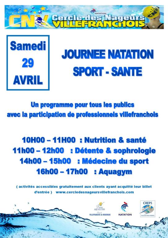 Il s'agit durant la journée du SAMEDI 29 AVRIL 2017 d'offrir aux usagers d'Aqualudis et à l'ensemble de la population ( tout public - tous ages ) la possibilité de bénéficier de conseils santé et bien etre par des professionnels villefranchois diplomés, en l'espece : nutritionniste - medecin du sport - sophrologue et maitre nageur. Les intervenants animent des débats-discussions sur le theme santé et pratique de la natation dans la salle de reunion de la piscine.